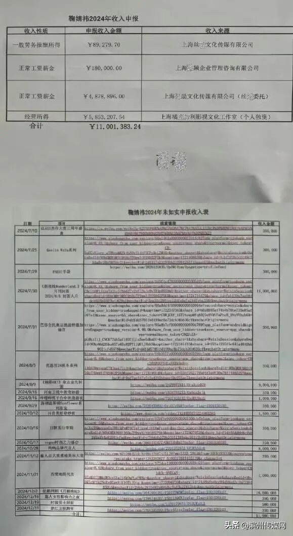 记者注意到,名为“实名举报信”上的内容显示,实名举报者提到,鞠婧祎在2024年全年申报收入1100余万元纳税,但“仅2024年6月-12月期间,鞠婧祎参加的影视、商务等活动就不下20多项,保守估计收入不少于5000万。”举报人称,鞠婧祎瞒报比率近88%。