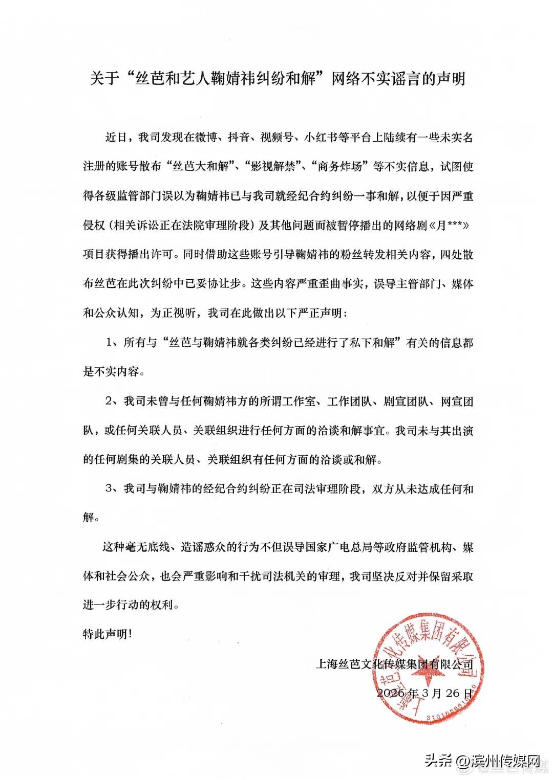 近日,我司发现在微博、抖音、视频号、小红书等平台上陆续有一些未实名注册的账号散布“丝芭大和解”、“影视解禁”、“商务炸场”等不实信息,试图使得各级监管部门误以为鞠婧祎已与我司就经纪合约纠纷一事和解,以便于因严重侵权(相关诉讼正在法院审理阶段)及其他问题而被暂停播出的网络剧《月》项目获得播出许可。同时借助这些账号引导鞠婧祎的粉丝转发相关内容,四处散布丝芭在此次纠纷中已妥协让步。这些内容严重歪曲事实,误导主管部门、媒体和公众认知,为正视听,我司在此做出以下严正声明: